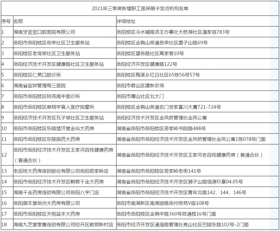 根据国家医保局2号令《医疗机构医疗保障定点管理暂行办法》和国家医保局3号令《零售药店医疗保障定点管理暂行办法》的规定,经过医药机构自愿申请、医保部门资料审核、准入评估小组现场评审,拟将岳阳市岳阳楼区岳荣社区卫生服务站等18家医药机构确定为岳阳市本级医疗保障定点医药机构,现予公示,公示期限自2021年10月28日至2021年11月3日,如对公示对象有异议,任何单位和个人可向岳阳市医保事务中心反映,接受社会各界的监督。