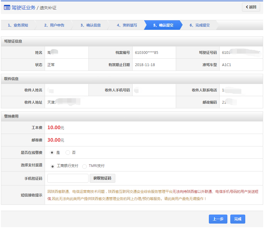 再次确认信息以后,点击【获取验证码】,系统会发送6位验证码到用户绑定的手机,用户输入手机验证码后,点击【完成】,进入步骤6【完成提交】。如果选择在线支付,提交后自动跳转至支付页面进行网上付款。