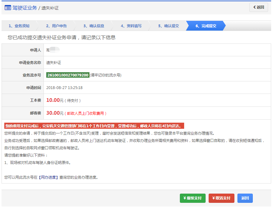 该步骤显示用户的驾驶证信息、领取详情以及需要缴纳费用信息,如果平台已开通在线支付功能,显示在线支付详情。