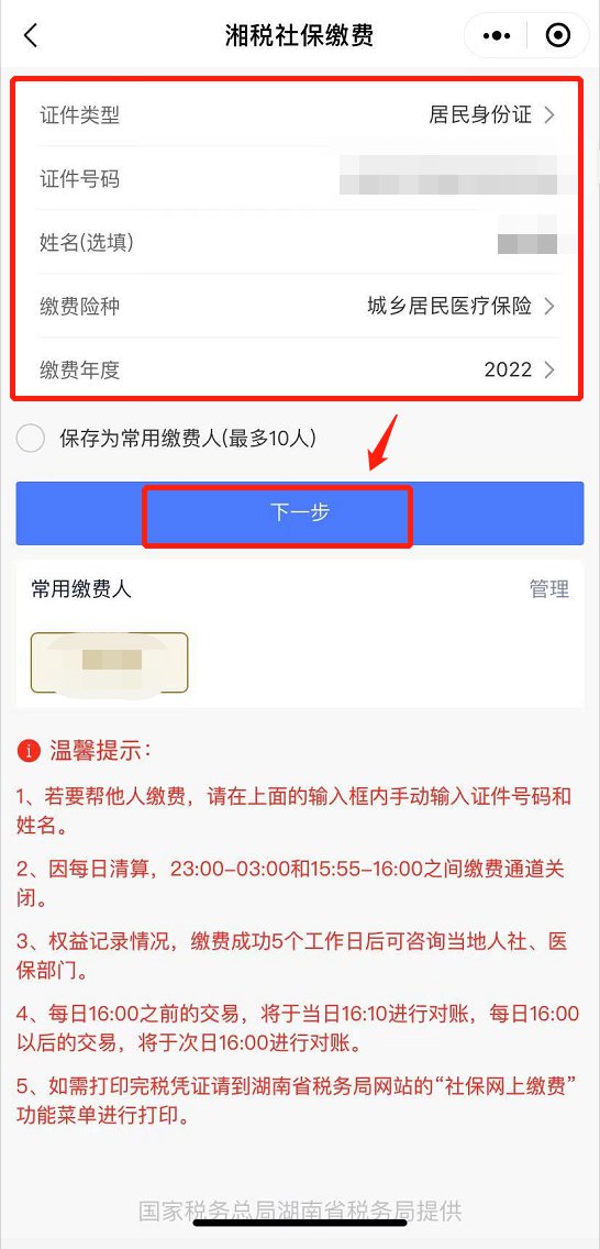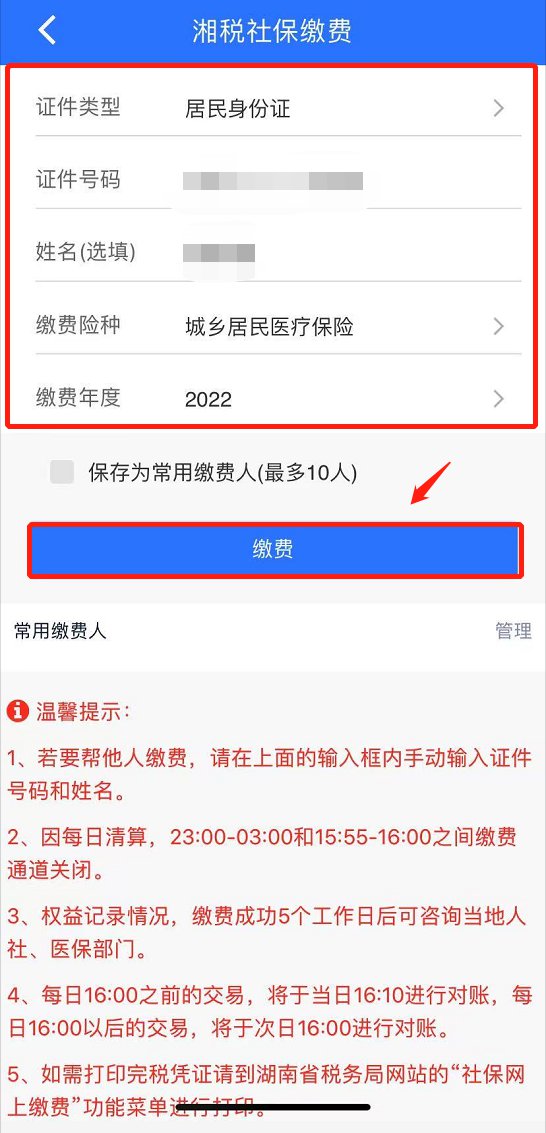 ②“湘税社保”APP:登陆后在首页点击“城乡居民缴费”,填写证件类型、证件号码、姓名,选择“缴费险种-城乡居民医疗保险”,选择缴费年度,点击“缴费”,提交缴费完成即可。