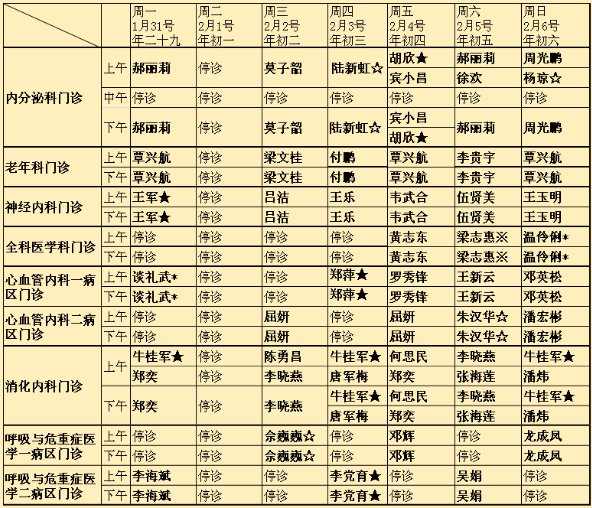 根据国务院办公厅关于2022年部分节假日安排的通知,春节1月31日至2月6日放假调休,共7天。为保障广大市民正常就医,现将我院2022年虎年春节门诊排班表公布如下: