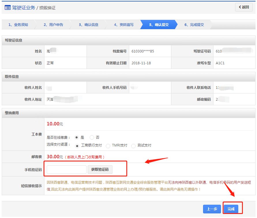 再次确认信息以后,点击【获取验证码】,系统会发送6位验证码到用户绑定的手机,用户输入手机验证码后,点击【完成】,进入步骤6【完成提交】。如果选择在线支付,提交后自动跳转至支付页面进行网上付款。