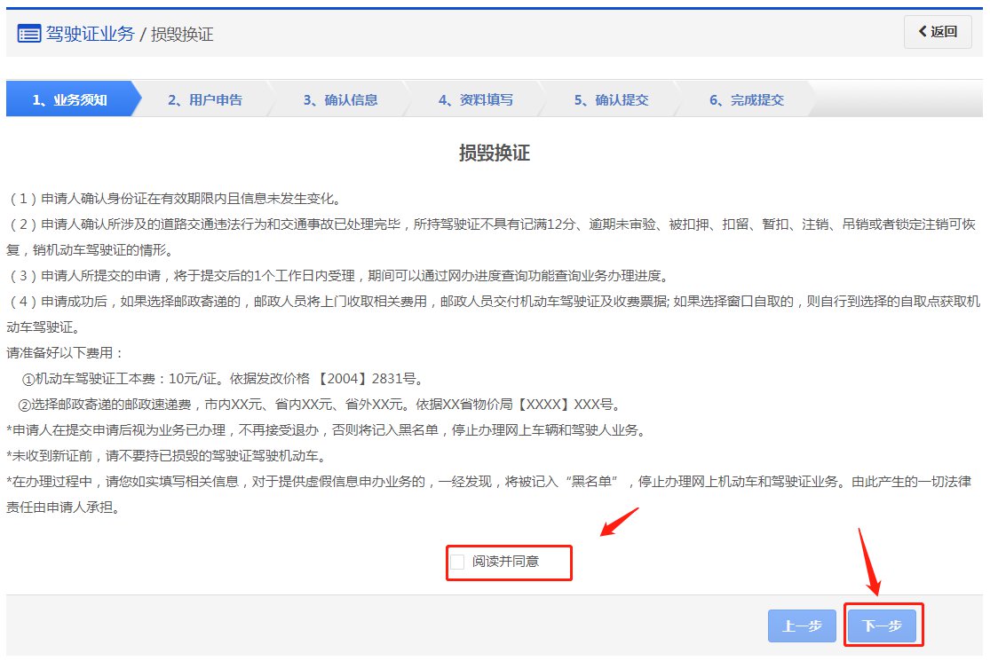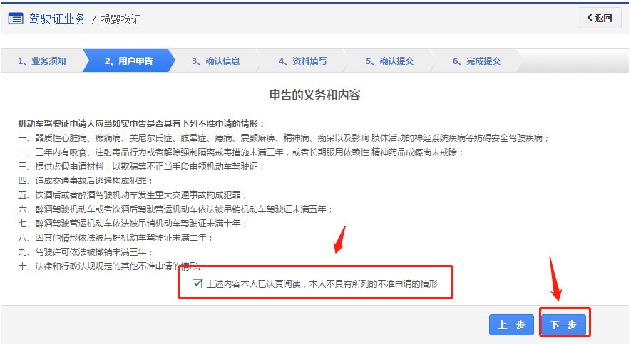 在该步骤,用户需认真阅读其内容,包括:办理损毁换证需要注意的各项内容和相关责任,如下图所示。同意的,勾选“阅读并同意”,点击【下一步】进入步骤2【用户申告】。