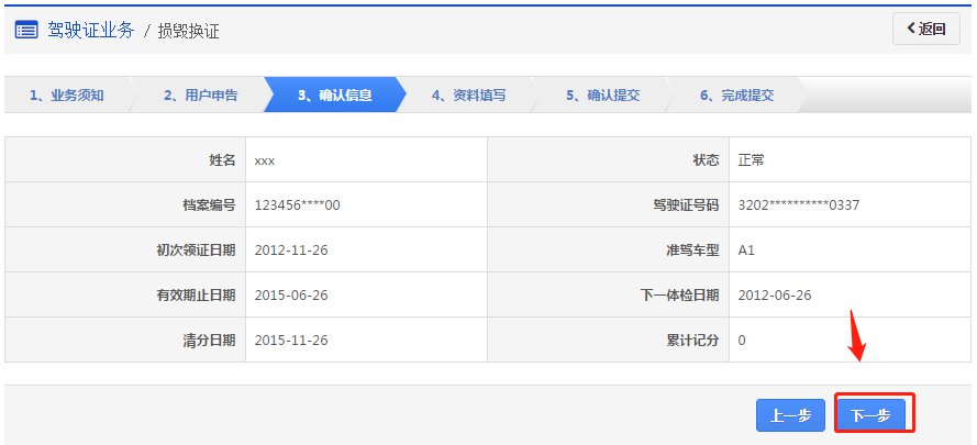 在该步骤,界面显示驾驶证的基本信息,用户认真确认各项信息无误后,点击【下一步】进入步骤4【资料填写】。