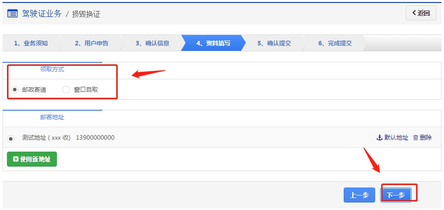 在该步骤,用户选择领取方式是邮政寄递或窗口自取。业务成功受理后,如果选择邮政寄递的,邮政人员将上门收取相关费用,交付机动车驾驶证及收费票据。如果选择窗口自取的,则自行到选择的自取网点窗口领取机动车驾驶证。