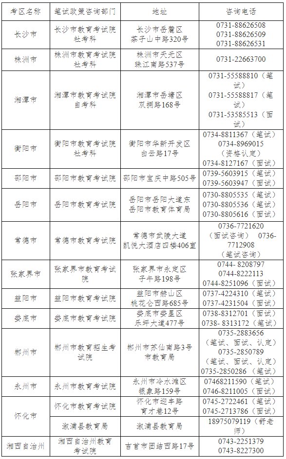 (七)湖南省中小学教师资格考试(笔试)各考区(市州教育考试院)联系地址和电话如下表:
