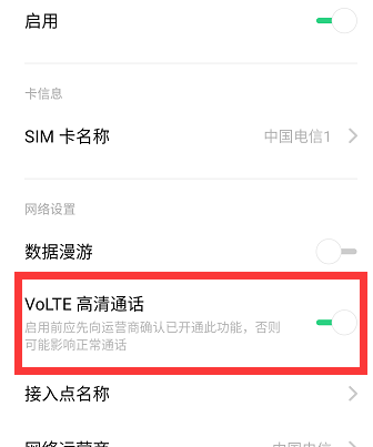 2、点击一张卡,找到“启用VoLTE高清通话”选项,点击开启。
