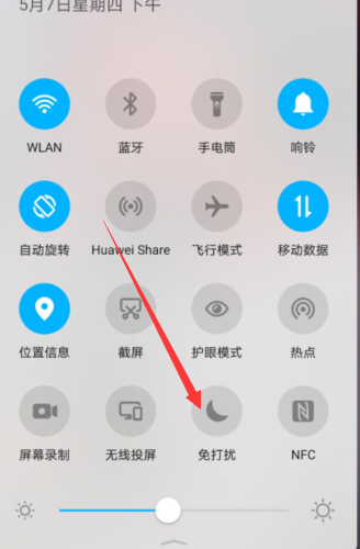 在手机桌面下拉通知栏,找到并点击【免打扰】选项,使其呈现灰色即可。
