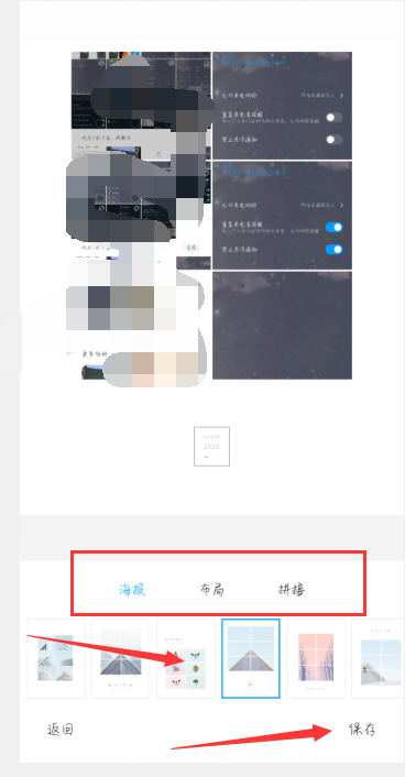 4、在页面下方会有【海报】、【布局】、【拼接】三种拼图方式,任意选择即可,最后保存就拼好了。