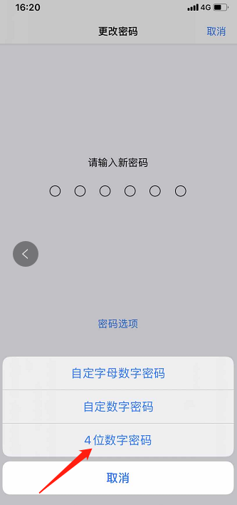 4、输入新密码的时候,点击“密码选项”,然后选择“4位数字密码”即可。