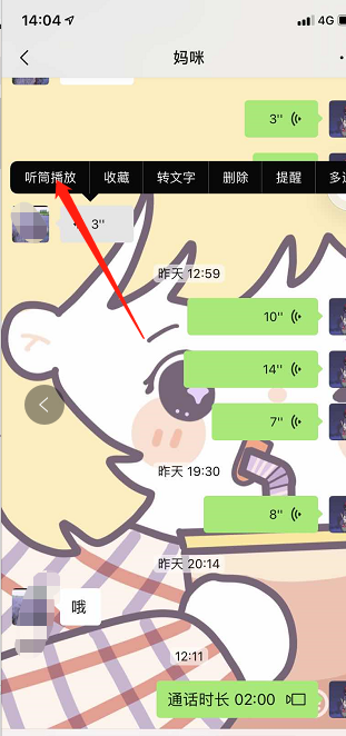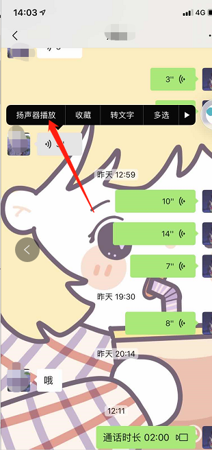 2、长按语音,选择扬声器播放,即可切换到扬声器模式;