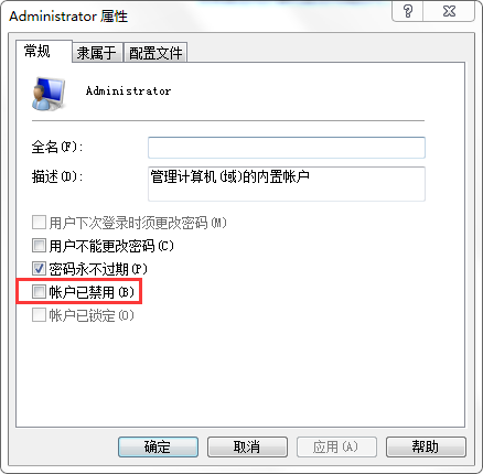 4、取消“账户已禁用”,不要禁用管理员账号。