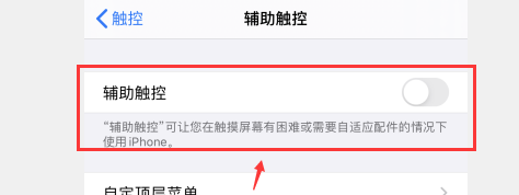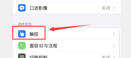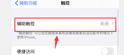 2、点击触控,点击辅助触控,将辅助触控后面的开关打开即可调出屏幕小圆球。
