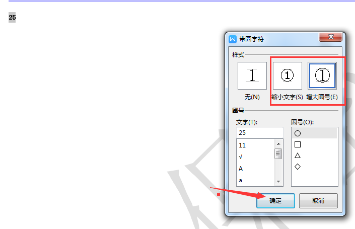3、在弹出的菜单中,选择增大圈号,或者是缩小文字的样式,设置好后,单击确定即可。
