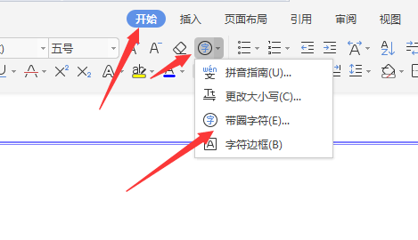 2、选中数字,在开始菜单栏点击带圈的字符号,选择带圈字符。