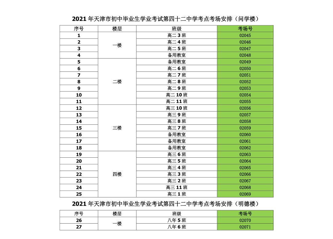 2021年天津市中考将在6月19日-20日进行,6月19日9:00-11:00考语文,6月19日14:00-15:40考数学,6月20日9:00-11:00化学物理合场考试,6月20日14:00-15:40考英语。