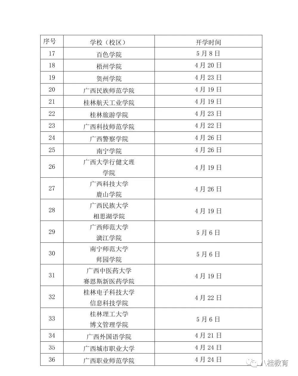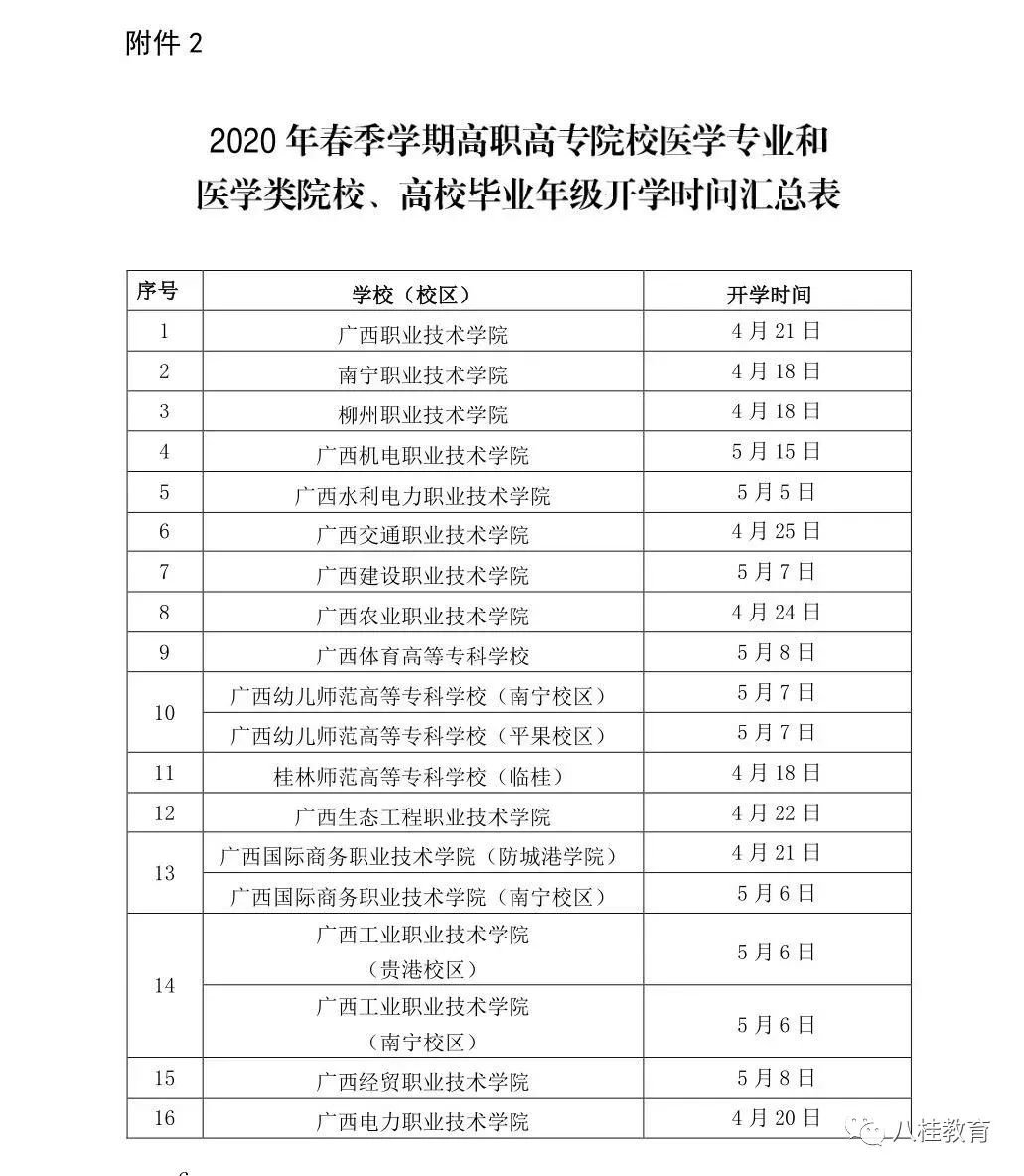根据自治区教育厅桂教高教〔2020〕19号文件通知精神,2020年春季学期本科高校医学专业和医学类院校、高校毕业年级开学时间已确定,将在2020年4月18日起有序开学,广西中医药大学开学时间为4月21日。请同学们关注学校通知,按照学校发布的通知要求按批次有序返校。