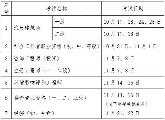 根据新冠肺炎疫情防控进展情况,经商有关部门,原计划于今年上半年举行的2020年度注册建筑师等职业资格考试,调整至今年下半年举行;原计划于10月31日、11月1日举行的2020年度经济专业技术资格考试(初、中级),调整至11月21、22日举行。