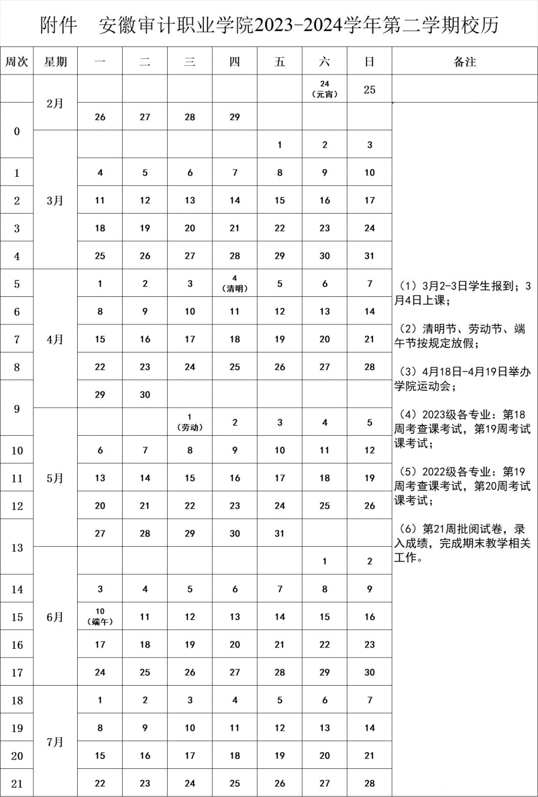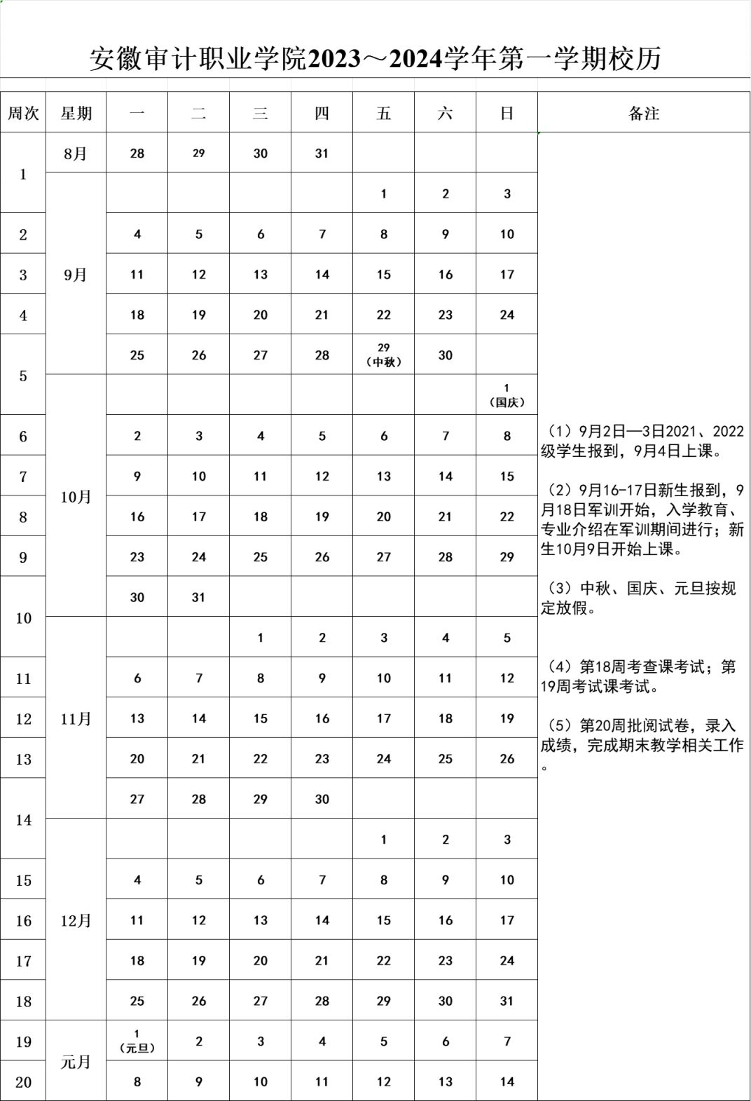 2023-2024安徽审计职业学院校历(寒暑假放假时间)