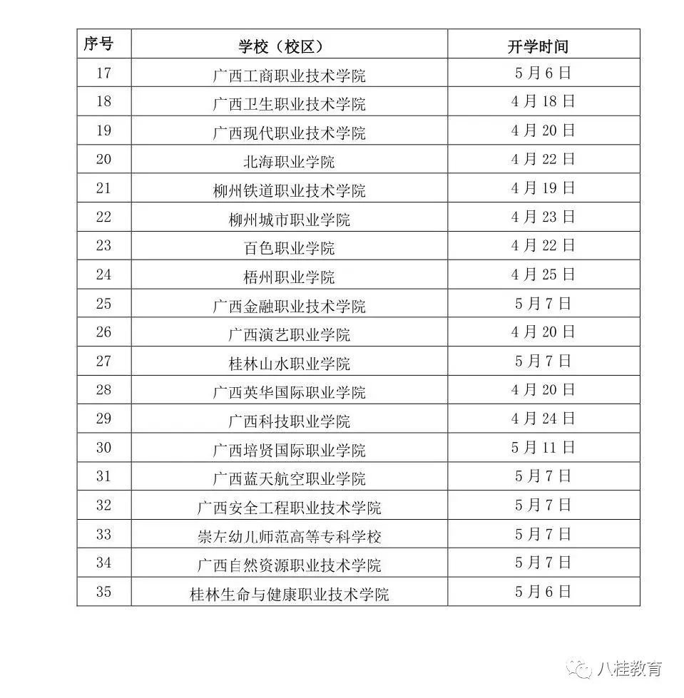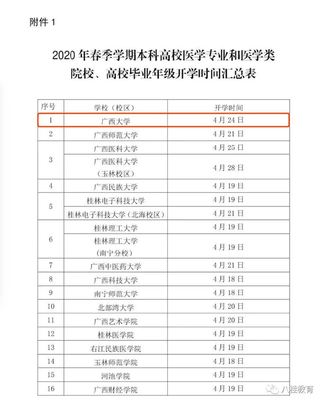 近日,自治区教育厅印发《关于做好2020年春季学期高校医学专业和医学类院校、高校毕业年级开学工作的通知》(桂教高教〔2020〕19号)明确:经评估验收合格,并报自治区新型冠状病毒感染的肺炎疫情防控工作领导小组指挥部批准,全区高校医学专业和医学类院校、高校毕业年级自4月18日起按照各校确定的开学时间有序开学(具体高校名单和开学时间附后)。各高校其他年级具体开学时间,由高校结合下一阶段疫情防控形势、开学准备和毕业年级开学后的情况研究确定,按程序报批后稳妥有序开学。