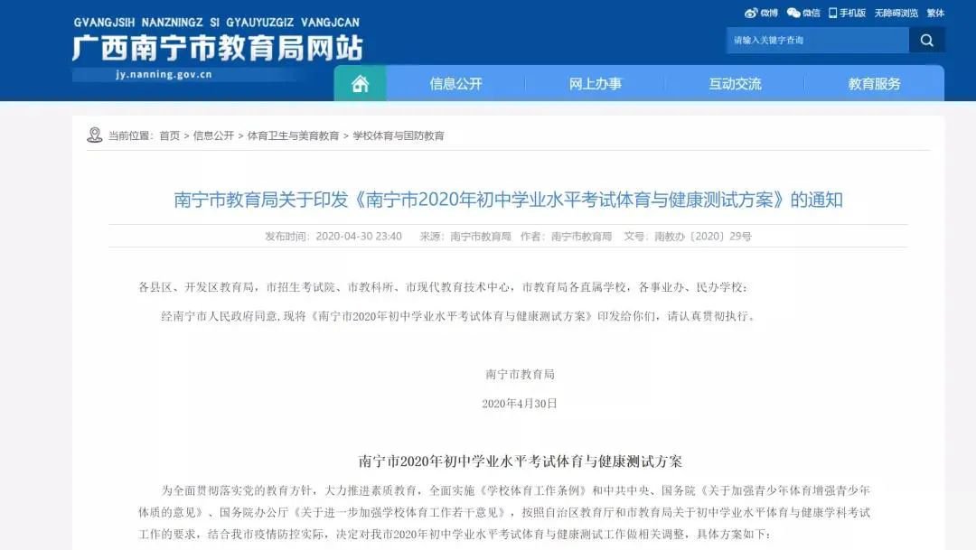 受疫情影响,今年初中毕业班学生开学推迟,应考压力加大,南宁市体育中考考不考一直是广大考生和家长关注的焦点。4月30日晚,南宁市教育局在官网发布了《南宁市2020年初中学业水平考试体育与健康测试方案》,明确今年体育中考,改为统一测试广播体操,成绩评定为合格和不合格两个等次,且成绩不计入中考总成绩。