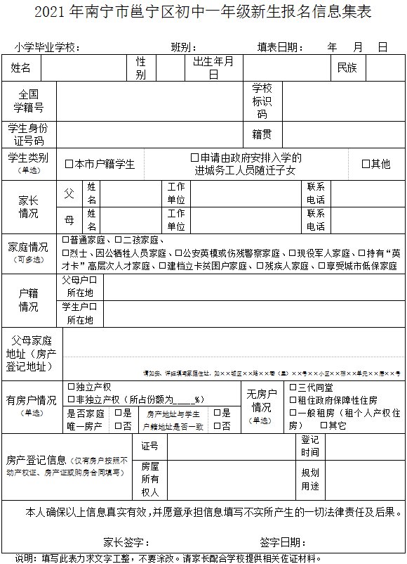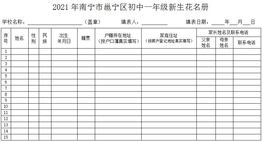 (六)2021年7月9日前,各初中学校审验新生报名材料,填写《2021年南宁市邕宁区初中一年级新生花名册》(附件2-3)一式两份报城区教育局核准。