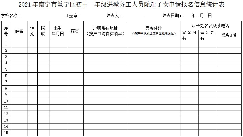 (五)2021年7月7日前,各进城务工人员随迁子女报名点将进城务工人员随迁子女报名材料及《2021年南宁市邕宁区初中一年级进城务工人员随迁子女申请报名信息统计表》(附件2-4)汇总报送城区教育局基础教育股。