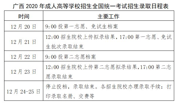 广西2020年成人高等学校招生全国统一考试招生录取工作将于12月20日至25日进行,其中,12月20日至21日录取考生第一志愿(包括免试生批次录取),12月22日至23日录取考生第二志愿。