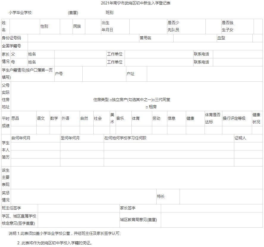 2.《2021年南宁市武鸣区初中新生入学登记表》中的“学生类别”按实际情况选填一项,“户口所在地”及“父母实际住房地址”要求按相关证件如实详细填写,“平时成绩”、“该生主要表现”由班主任填写。各学科成绩以等级形式呈现,由学校结合学生的综合表现从高到低确定A、B、C、D四个等级。