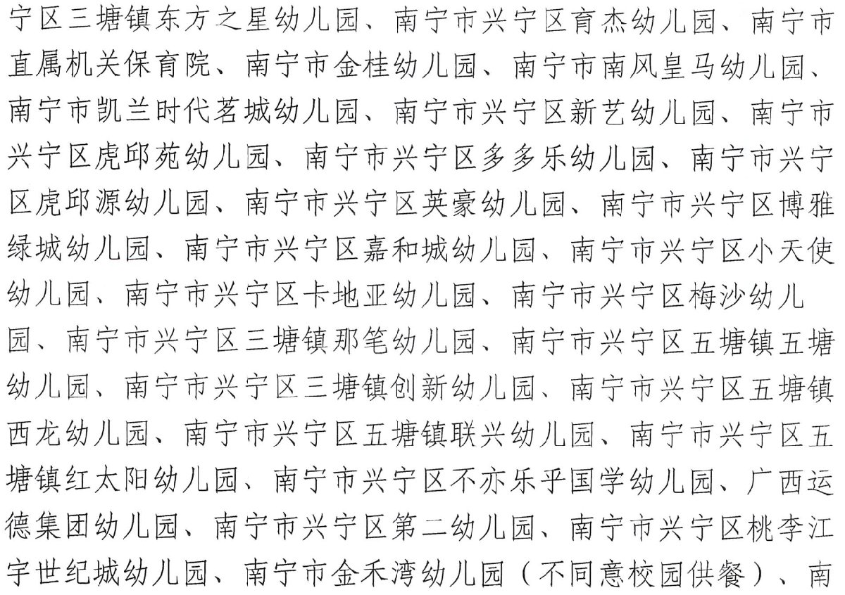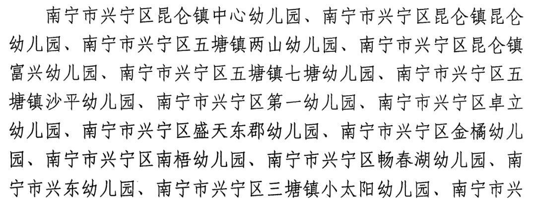 根据《南宁市新型冠状病毒肺炎疫情防控工作领导小组指挥部关于印发南宁市2020年春季学期特殊教育学校、幼儿园开学工作方案》、《南宁市新型冠状病毒肺炎疫情防控工作领导小组指挥部学校开学工作组关于开展全市2020年春季学期特殊教育学校、幼儿园开学准备工作、中小学校校内午托评估验收的通知》的要求,5月19-22日,城区政府认真组织教育局、卫生健康、市场监管局、消防等部门对辖区幼儿园的疫情防控与开学准备工作开展联合评估验收。结合验收情况,加强指导,反复核查,分批公布通过验收的幼儿园名单,现将第一批通过验收的44所幼儿园名单公布如下。