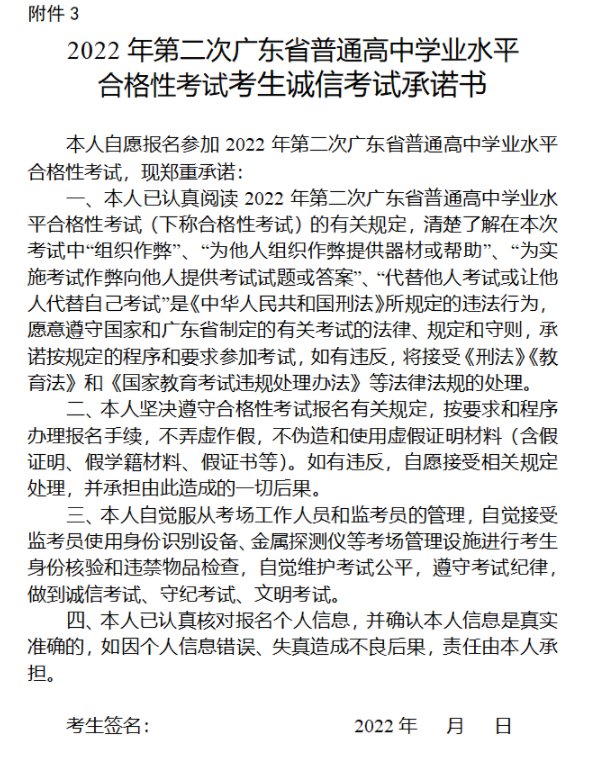 考生须在2022年6月10日至22日登录“广东省普通高中学业水平考试报名系统”自行打印准考证。各报名点(学校)要对考生打印准考证的情况及时进行检查,提醒考生认真核对姓名、准考证号、考试科目和照片等信息,发现错误信息及时向考点或县(区)招考机构反映。