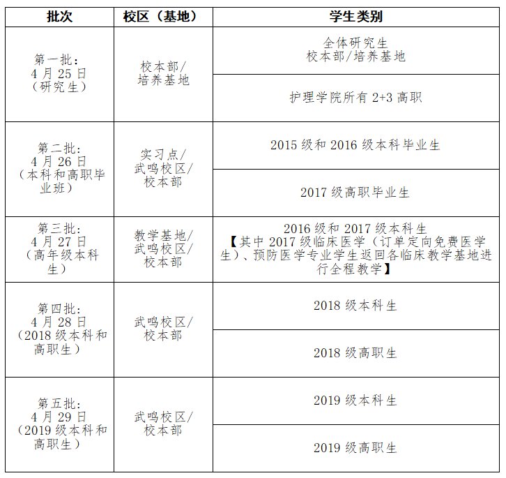 经自治区新冠肺炎疫情防控工作领导小组指挥部批准,广西医科大学自2020年4月25日起组织学生有序开学返校。现将开学返校具体事项通告如下。