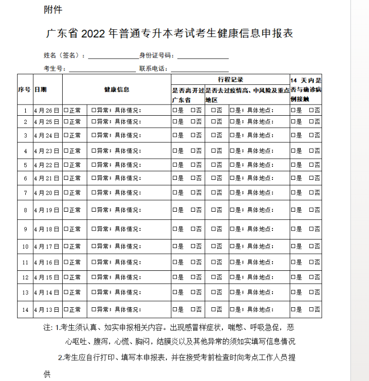 3.所有考生应在考前14天开始自我健康监测,据实填写《广东省2022年普通专升本考试考生健康信息申报表》(见附件);并于考前48小时内自行前往医院进行核酸检测。考试期间,考生提供粤康码、行程卡、考前48小时内核酸检测阴性证明和考生健康信息申报表供工作人员核验无异常后进入考点。