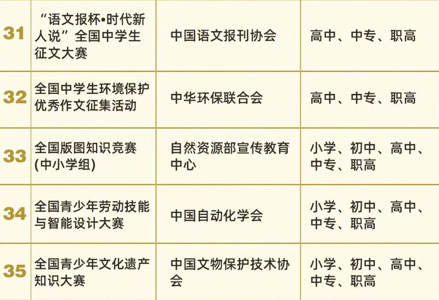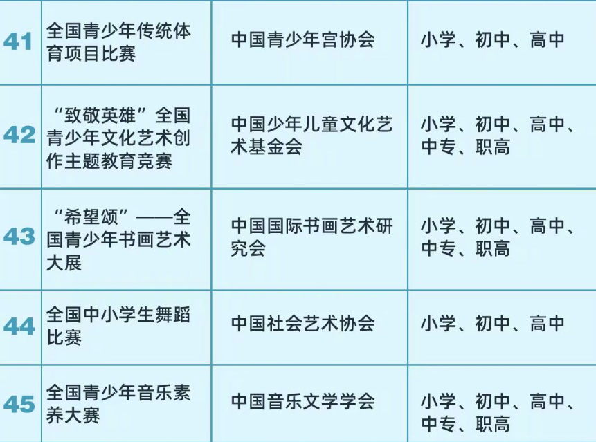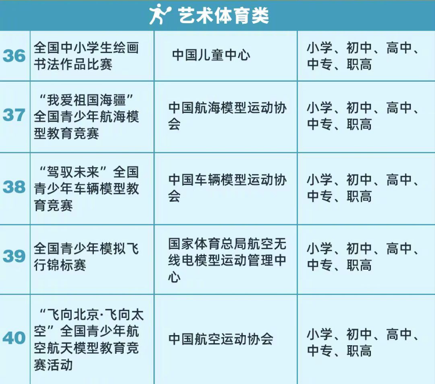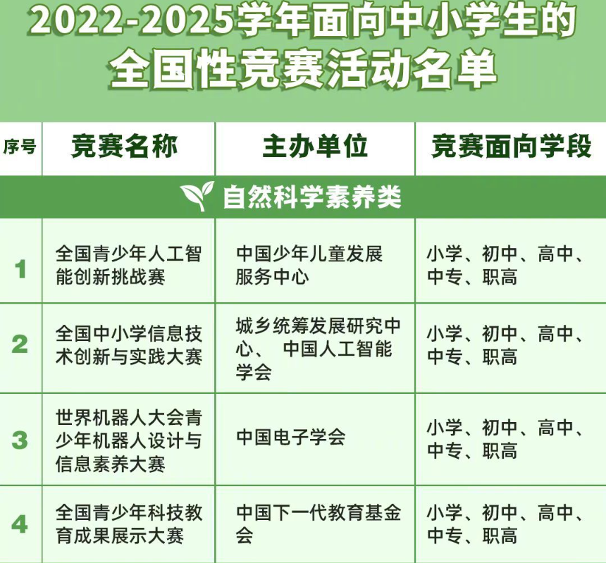 根据《教育部办公厅等四部门关于印发〈面向中小学生的全国性竞赛活动管理办法〉的通知》精神,由主办单位自主申报,经组织专家进行严格评审把关,拟确定全国青少年人工智能创新挑战赛等45项竞赛为2022—2025学年面向中小学生开展的全国性竞赛活动,举办时间原则上为2022年9月至2025年8月,在此期间每学年举办不得超过1次,累计不超过3次。