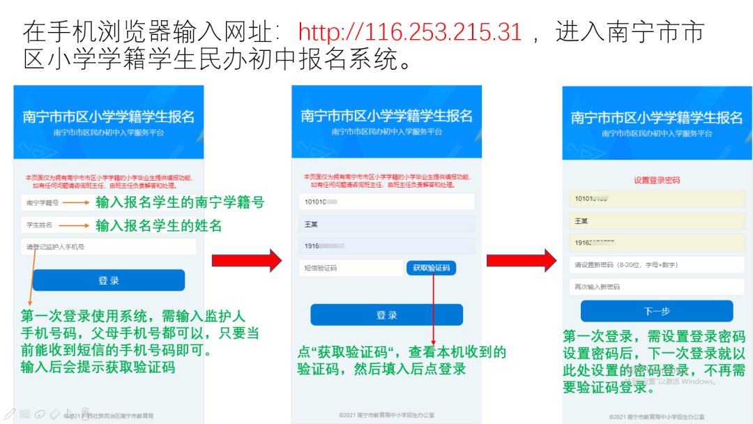 首先由学生家长自行在市区民办初中网上报名系统中网上报名(网址:http://116.253.215.31),之后在就读小学办理报名信息确认手续,信息确认后才算报名成功。逾期不办理信息确认手续的,报名信息无效。