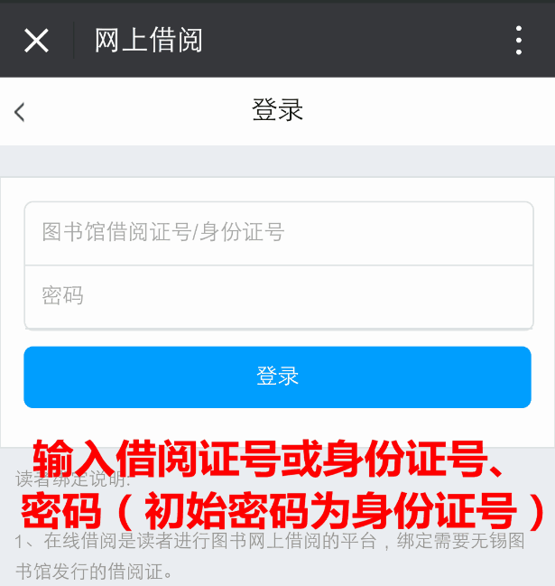 2、点击右上角【登录】输入借阅证号或办证时身份证号、密码(初始密码为身份证号),即可成功绑定。