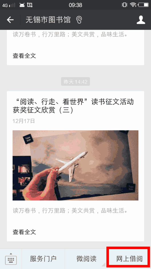 1、关注“无锡市图书馆”官方微信,点击底部菜单栏【网上借阅】