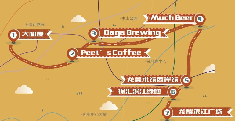 路线:大和屋-Peet's Coffee-Daga Brewing-永康路-Much Beer-龙美术馆西岸馆-徐汇滨江绿地-龙耀滨江广场