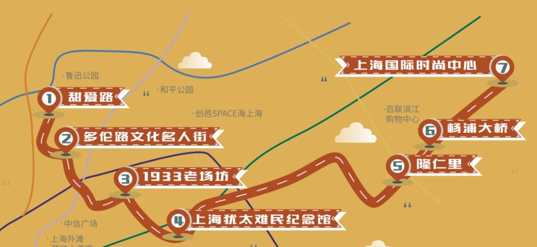 路线:甜爱路-多伦路文化名人街-1933老场坊-上海犹太难民纪念馆-隆仁里-杨浦大桥-上海国际时尚中心