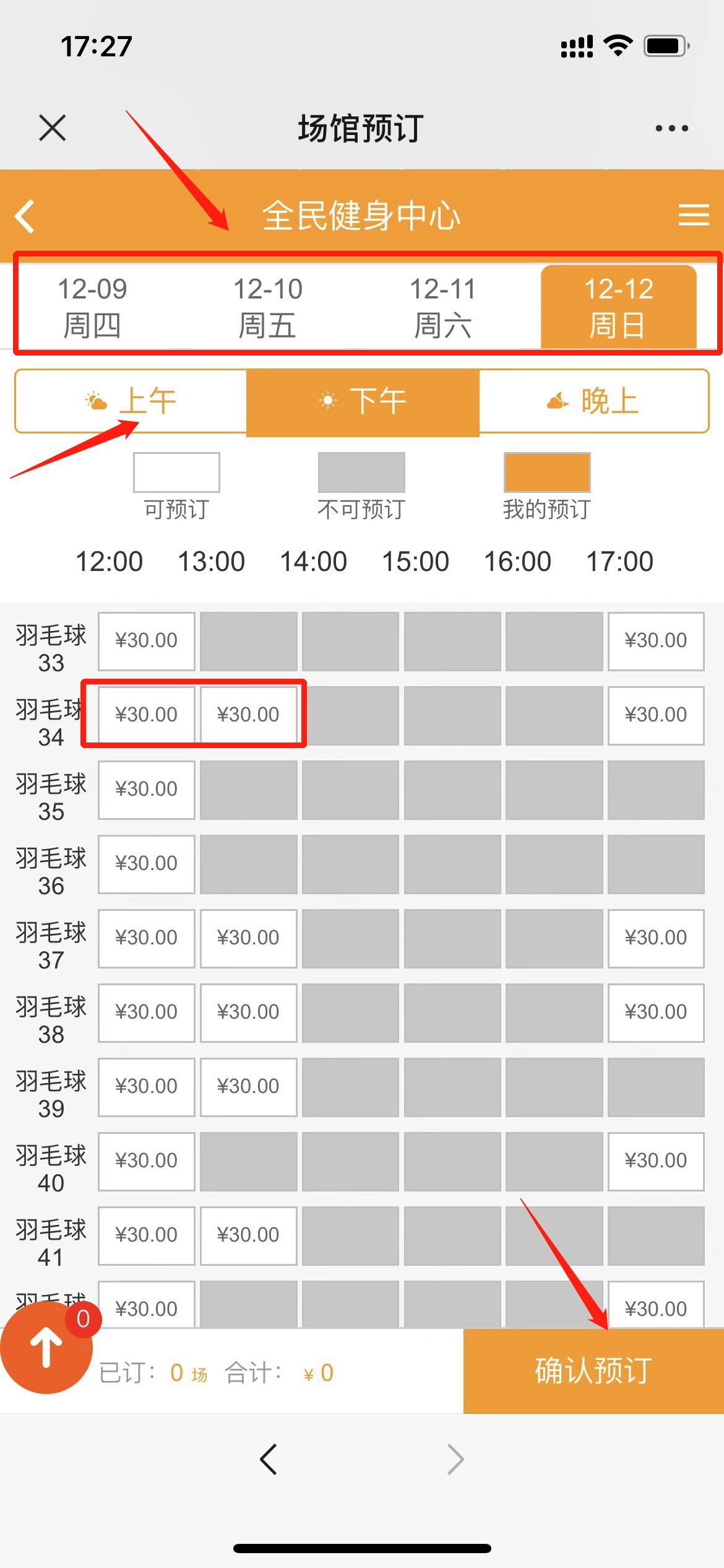 选择“日期”→“上午/下午/晚上”→“12:00,13:00...”→选择空白的场地,点击“立即预定”