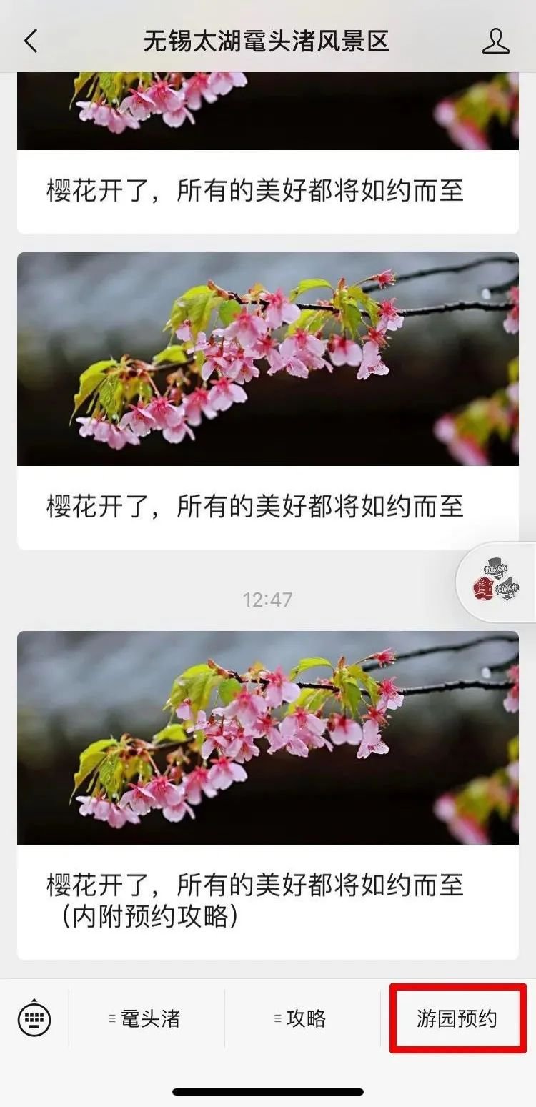 2、关注无锡太湖鼋头渚风景区微信公众号提前一天扫描鼋头渚“游园预约码”进行线上预约,预约成功后在景区门口出示预约成功短信并进行健康检测。
