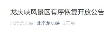 根据《新冠肺炎流行期间北京市等级旅游景区防控指引》,结合龙庆峡风景区实际,现将景区有序恢复开放相关事宜公告如下: