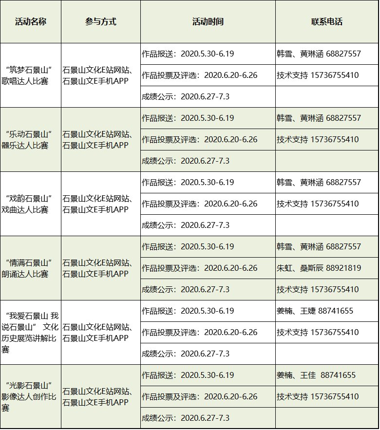 本届艺术节活动由石景山区文化和旅游局主办,以“战‘疫’有我,文化聚力”为主题,通过线上文化服务的方式,组织开展系列文艺赛事和艺术培训等活动,线下活动将随疫情进展酌情举办。