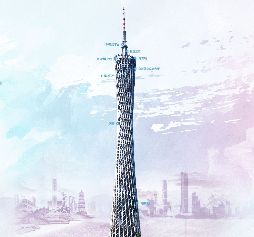 488米户外观景平台位于广州塔天线桅杆488米高处,是游客观光所能到达的最高点。2012年至2014年曾获吉尼斯世界纪录“最高观景平台”称号。立于广州塔之巅,可360度无障碍俯瞰羊城全貌,更能感受一览众山小的王者之风。