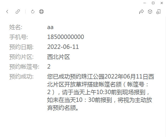 第四步:预约成功后将收到预约成功信息,游客凭此信息进入指定帐篷(含天幕)区域。