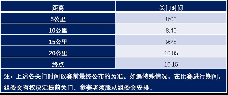 为了保证参赛者的比赛安全、顺利,比赛期间比赛路线各段设关门时间,限时对社会交通封闭。关门时间后,相应路段恢复社会交通。在规定的关门时间内,未跑完对应距离的参赛选手须立即停止比赛,退出赛道,以免发生危险。若有需要,退出比赛的选手可乘坐组委会提供的收容车或自行选乘公共交通抵达终点。