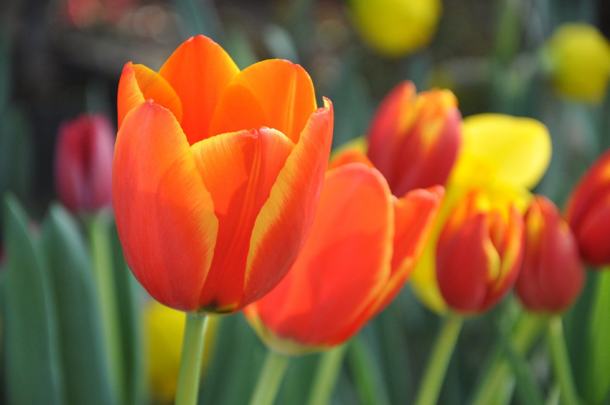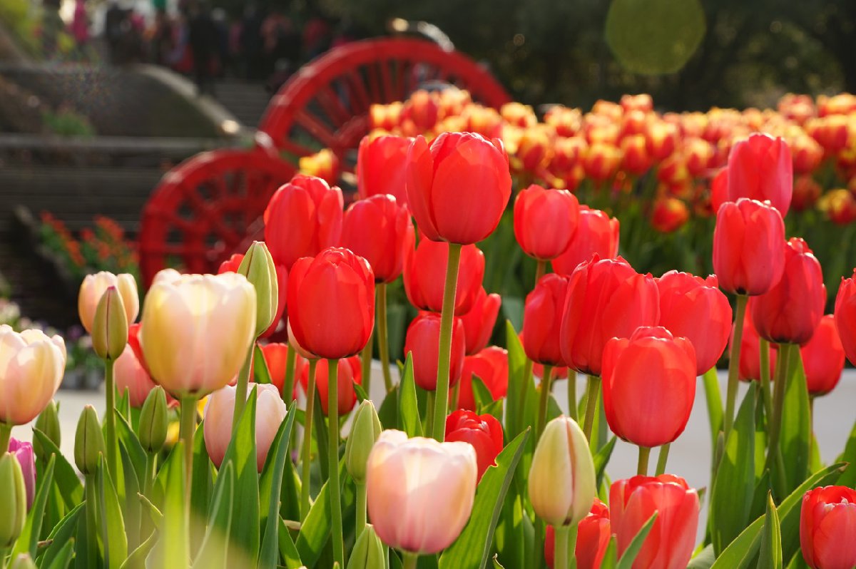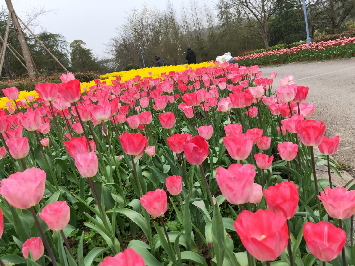 位于植物园大门入口、中心广场、展览温室等地的郁金香已绚丽绽放 红的、黄的、粉的..... 让人置身于一片花海之中。