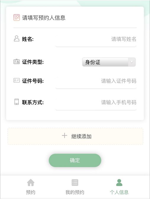 3、首次进入预约页面会自动跳转到个人信息录入页面,请填写真实姓名、证件类型、证件号码、联系方式等,点击“确定”,即可完成个人信息录入,转入预约页面。也可点击“继续添加”,填写新的预约人信息。