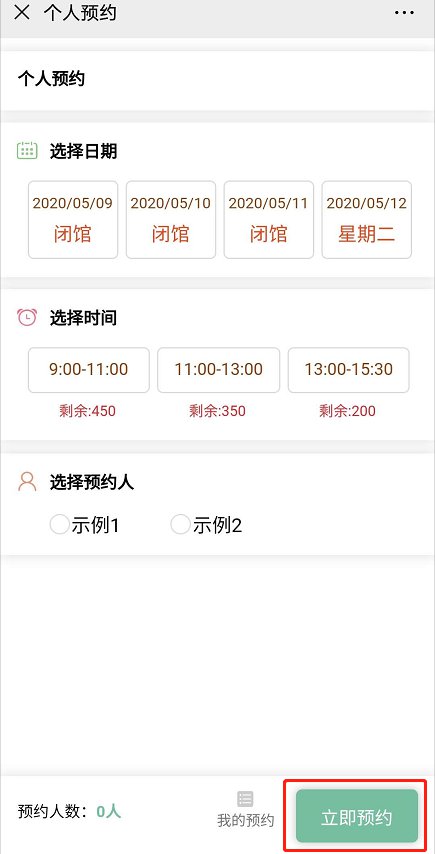 4、添加完成后进入预约页面,请根据自己的情况,选择参观日期、入馆时段、预约人,点击“立即预约”,就预约成功啦!每个预约订单最多可预约5人