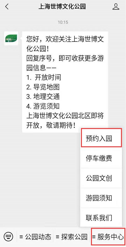 l 关注上海世博文化公园微信公众号,进入菜单栏“服务中心”,点击“预约入园”;